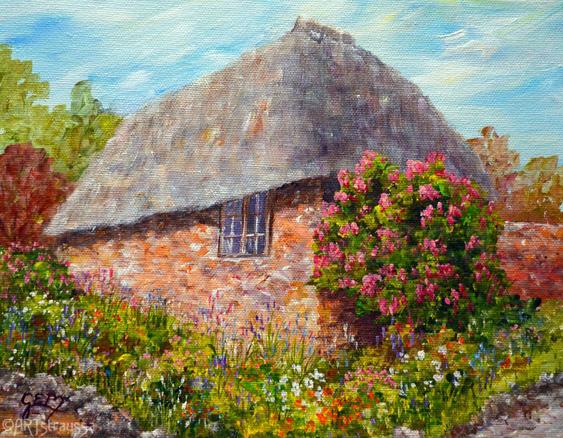 A tiny cottage surrounded by a bounty of garden plants and flowers is what makes up this painting. I painted this one as part of a cottage garden series, I really like the simplicity of it.