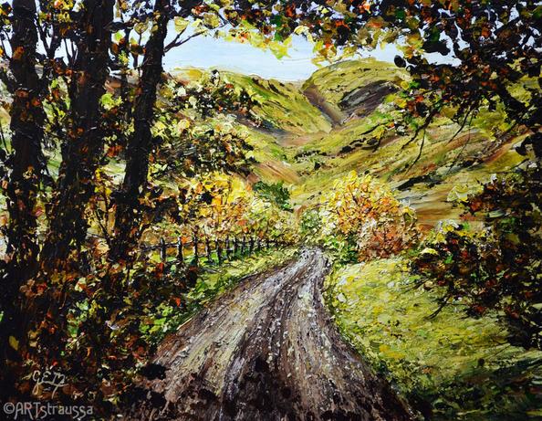 A beautiful country road filled with autumn trees and grass fields. This painting was done as part of a 30 palette knife paintings in 30 days challenge, I did back in September 2013.