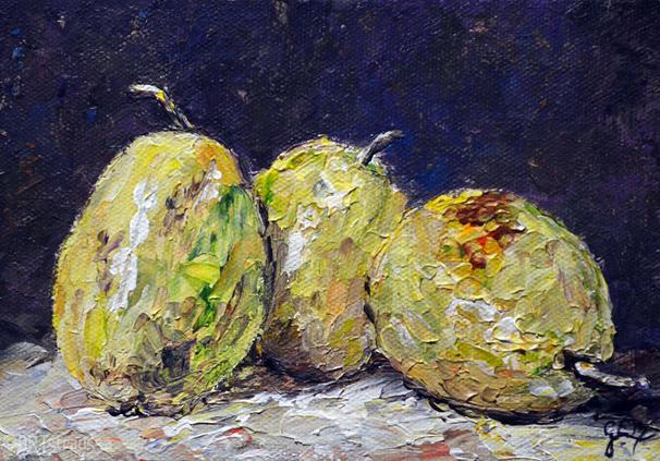 Three pears in a line against a dark background makes up this small still-life painting. A charity painting I did back in December 2014. I enjoyed working on this one adding all the juicy colors and textured into it.